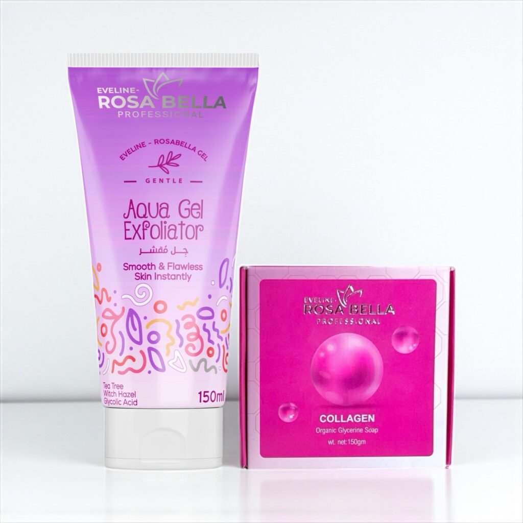 "Rosabella Aqua Gel Facial Exfoliator – A powerful gel that removes dead skin cells, clears pores, deeply hydrates, and leaves your skin fresh, radiant, and glowing from the very first use."